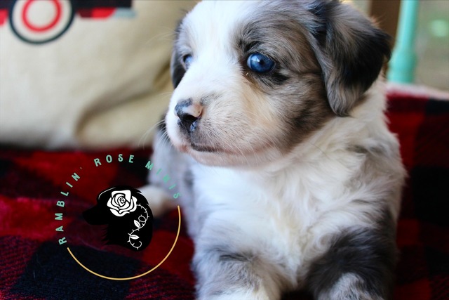 Spice is a bi blue merle(no copper points) female. She appears to have one blue eye and one marbled eye.